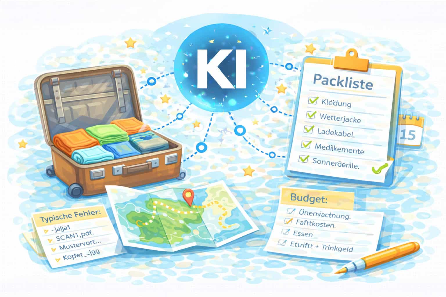 Alt Text Vorschlag: Symbolbild. Reiseplanung mit KI und Packliste