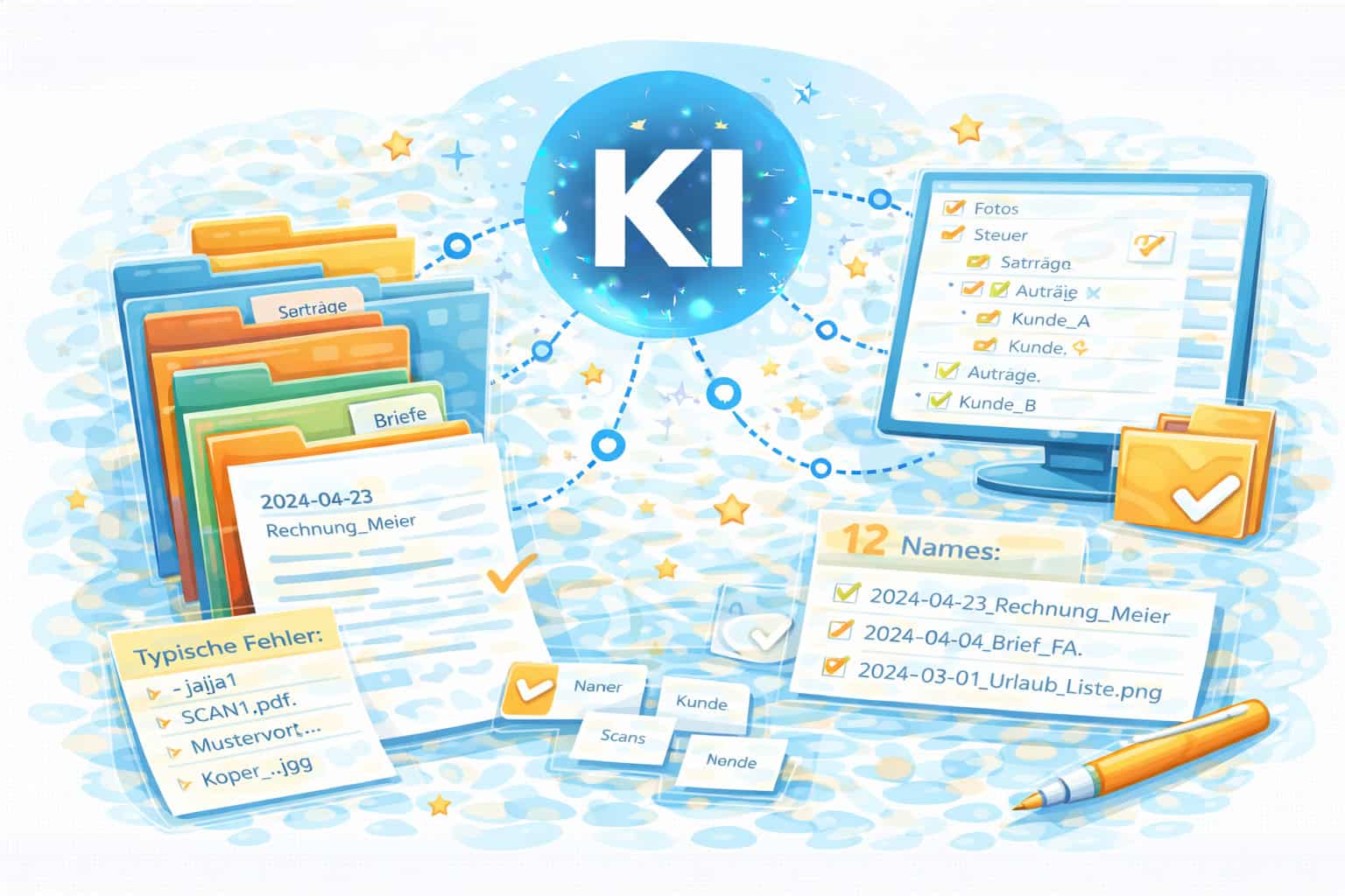 Bildvorschlag im gleichen Stil: Ordner, Etiketten, Dokumentblatt, Häkchen, KI-Kreis, Orange Akzente.