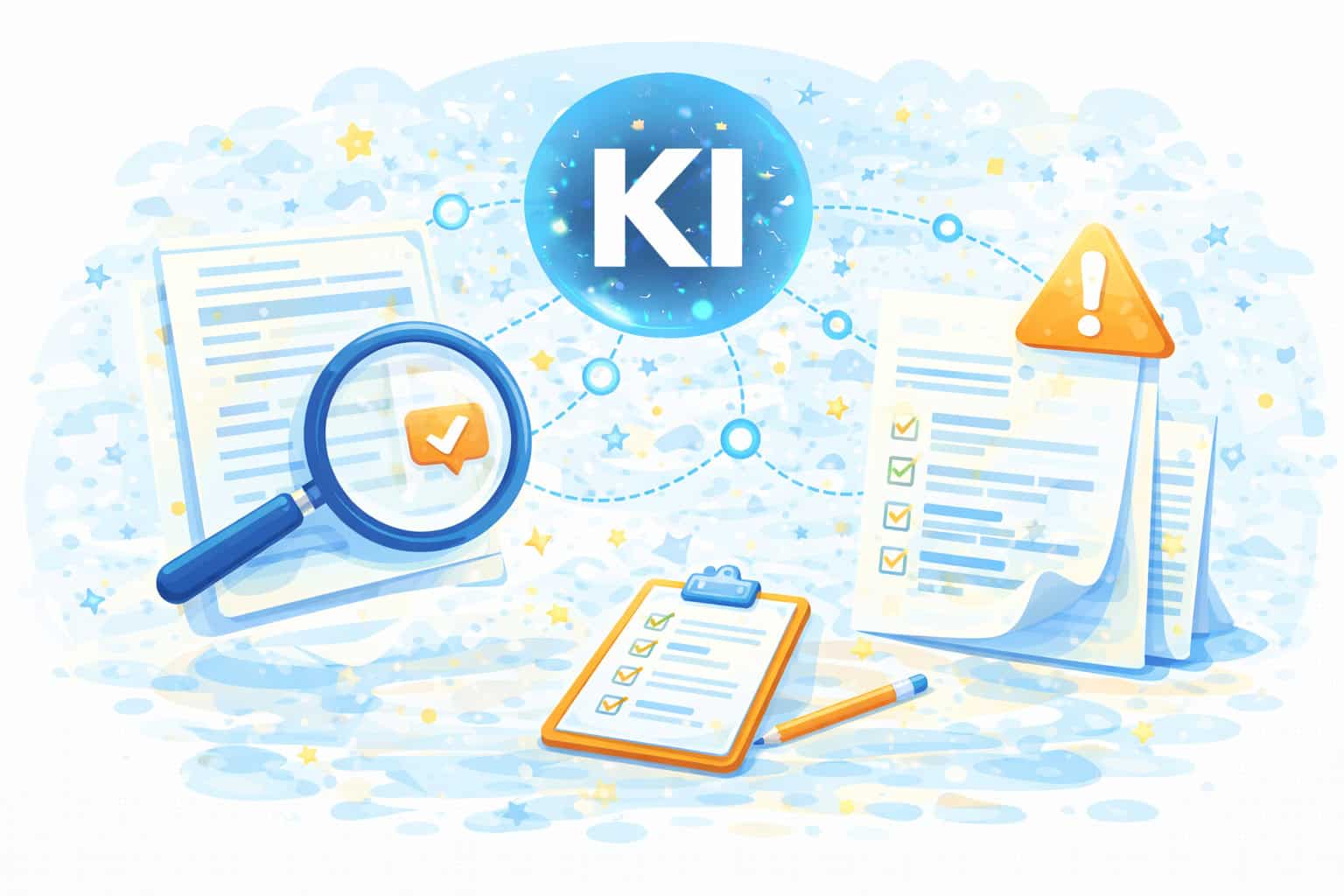 Bildvorschlag im gleichen Stil: Lupe, Dokument, Häkchen und Warnsymbol, „KI“ Kreis, Orange Akzent.