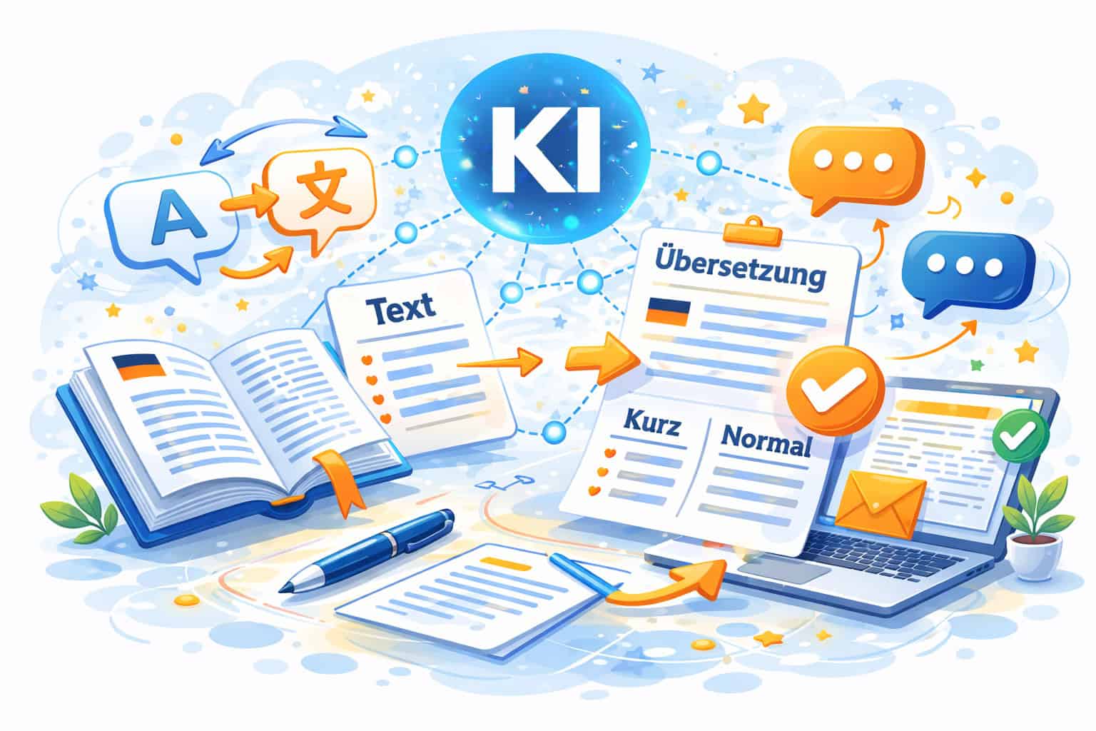 Bildvorschlag im gleichen Stil: Zwei Sprechblasen mit unterschiedlichen Zeichen, kleines Wörterbuch, Häkchen, KI-Kreis, Orange Akzente.